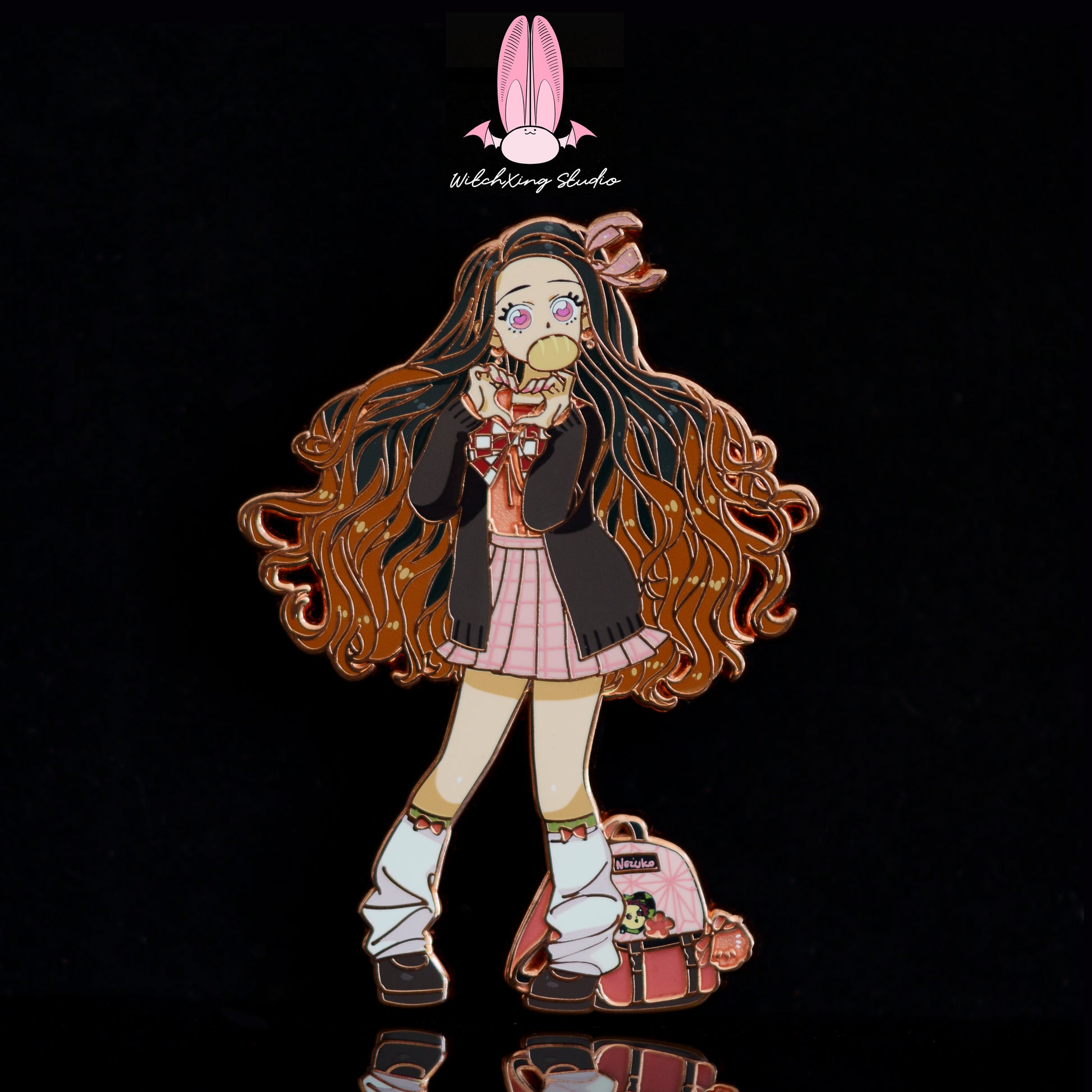 Plating Gold / rose gold with screen printed details, sandblast, glitter, and custom back stamp